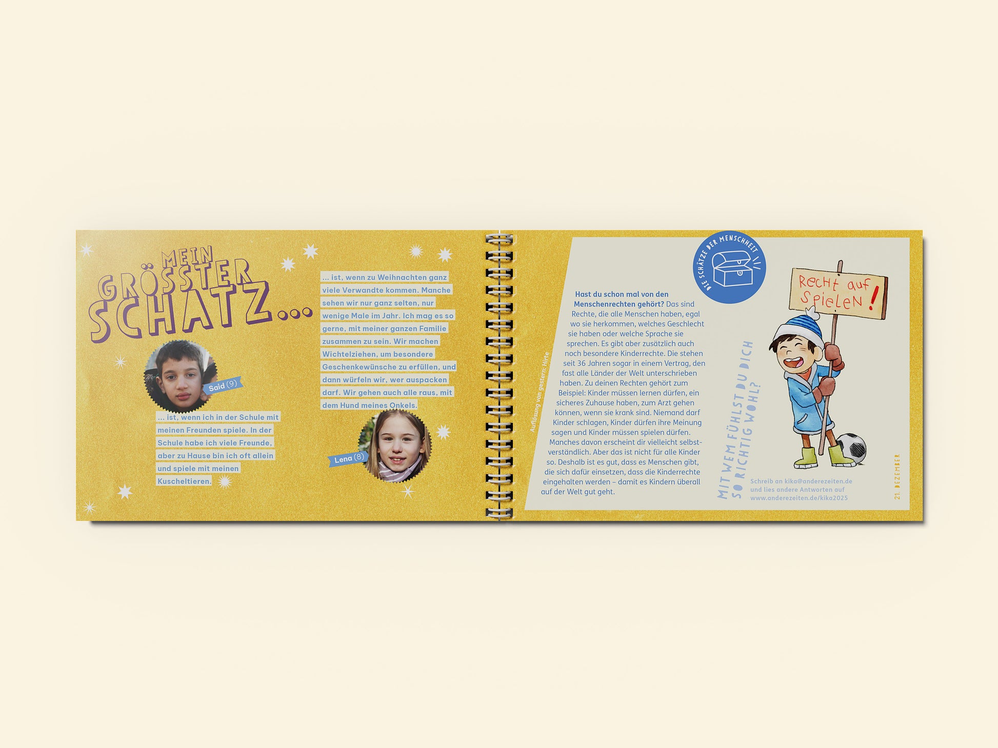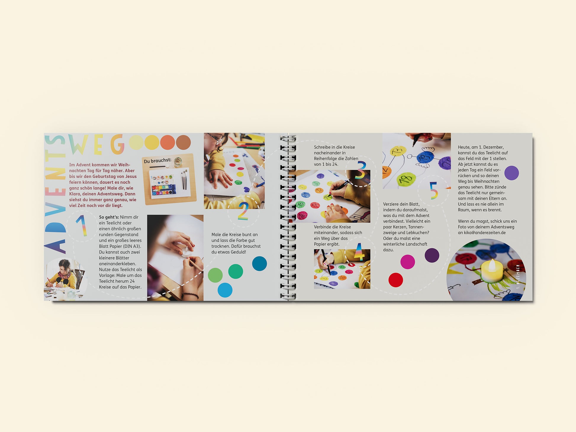 Schmökern, basteln, rätseln, staunen und lachen können Kinder im Grundschulalter. Ochs und Esel begleiten sie an jedem Tag mit einem Witz. Samstags erzählen in diesem Jahr Personen aus der biblischen Weihnachtsgeschichte ihre besonderen Erlebnisse. Auf den Sonntagsseiten entdecken Kinder die Schätze der Menschheit.