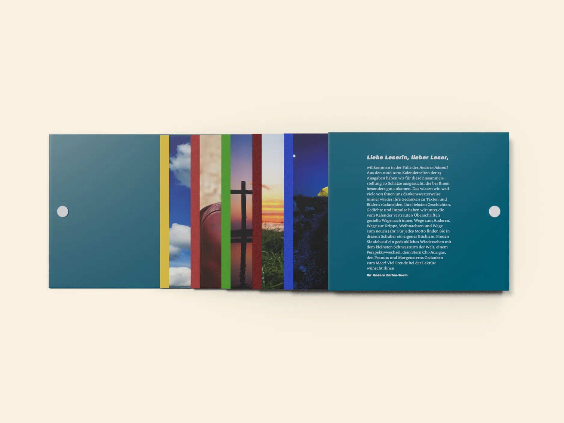 Jedem Kapitel entspricht eine Broschüre von 28 Seiten, gebunden mit hochwertigem Leinenfälzel, einzeln entnehmbar aus einem stabilen und verschließbaren Schuber. Er diente auch als Inspiration für den Titel: In diesem Schuber steckt die Fülle des Anderen Advent. Für helle und dunkle, nachdenkliche und fröhliche Stunden im Advent, zu Weihnachten und zum Jahreswechsel. Freuen Sie sich auf ein gedankliches Wiedersehen mit Ihren Lieblingstexten – und heben Sie neue Schätze! Und ein Hinweis für alle, die bereits unseren Sammelband Freude haben: Für Fülle haben wir ganz neu gegraben – kein Text kommt in beiden Büchern vor. Fülle.